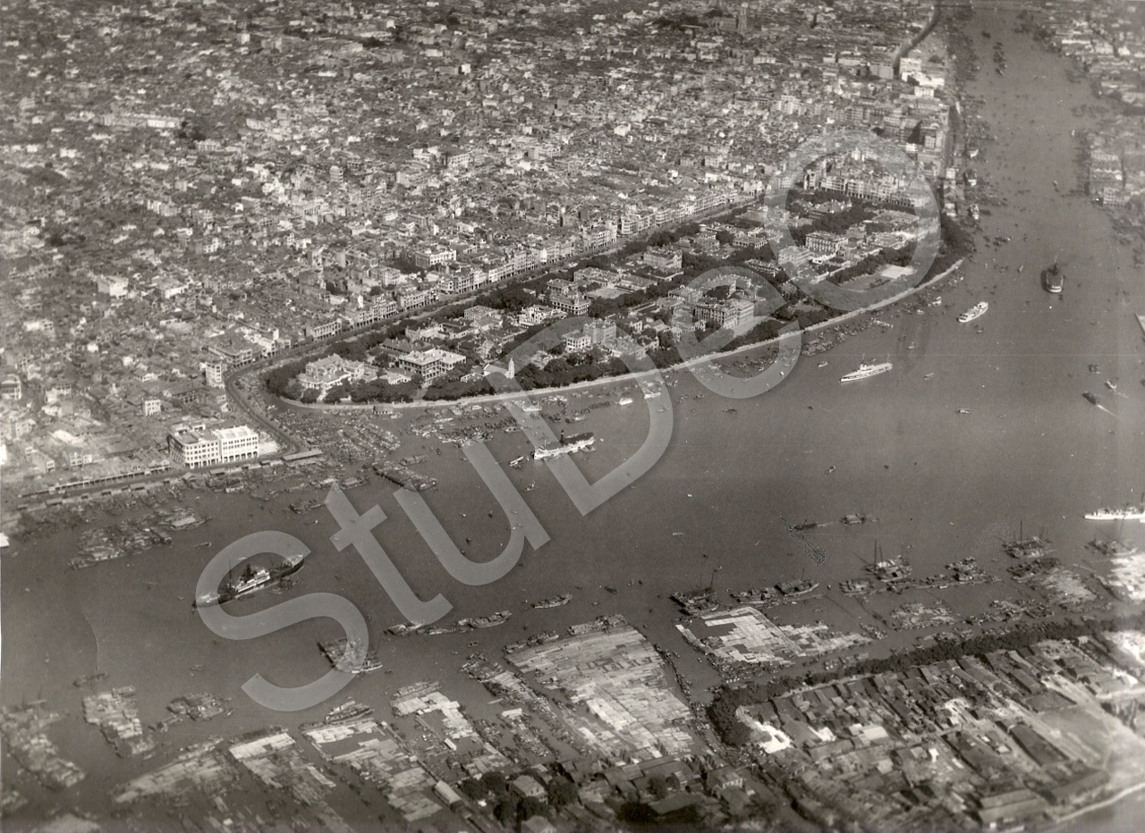 Beschreibung: Hauptsächlich Insel Shameen mit der englischen und französischen Konzession. Shameen ist umgeben vom Kanal Defence Creeck und dem Perlfluß. Im Hintergrund die Stadt Canton.