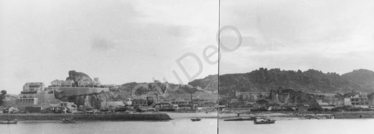 Beschreibung: Ufer mit Felsen vermutlich des Perlflusses nahe Kanton, vereinzelt Häuser.