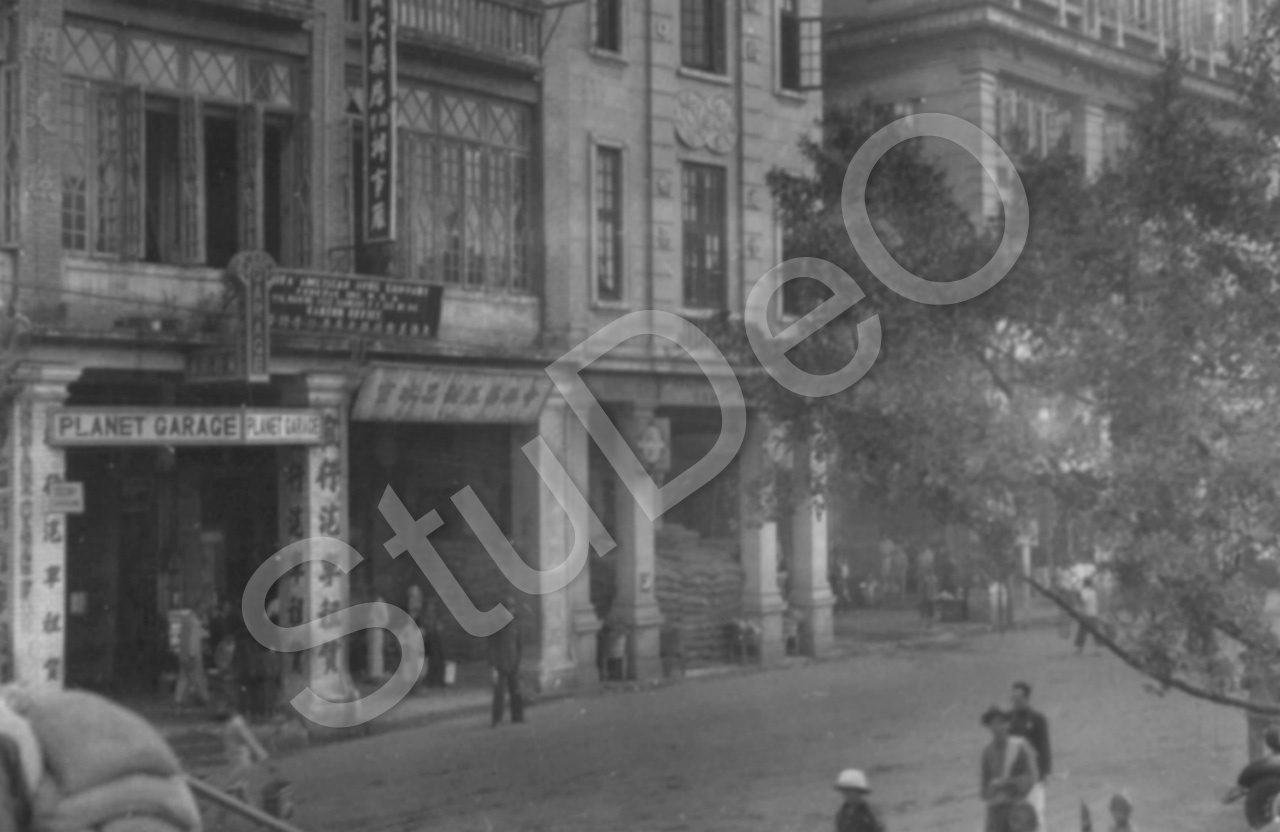 Beschreibung: Häuserzeile mit Schutzwällen aus Sandsäcken zum Schutz gegen Angriffe der Japaner. „Planet Garage“.