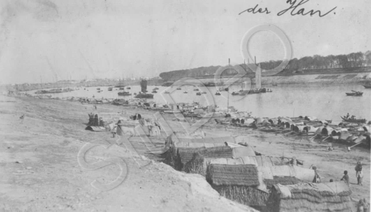 Beschreibung: Ufer am Han-Fluß bei der Mündung in den Yangtze. Hausboote und Strohhütten.