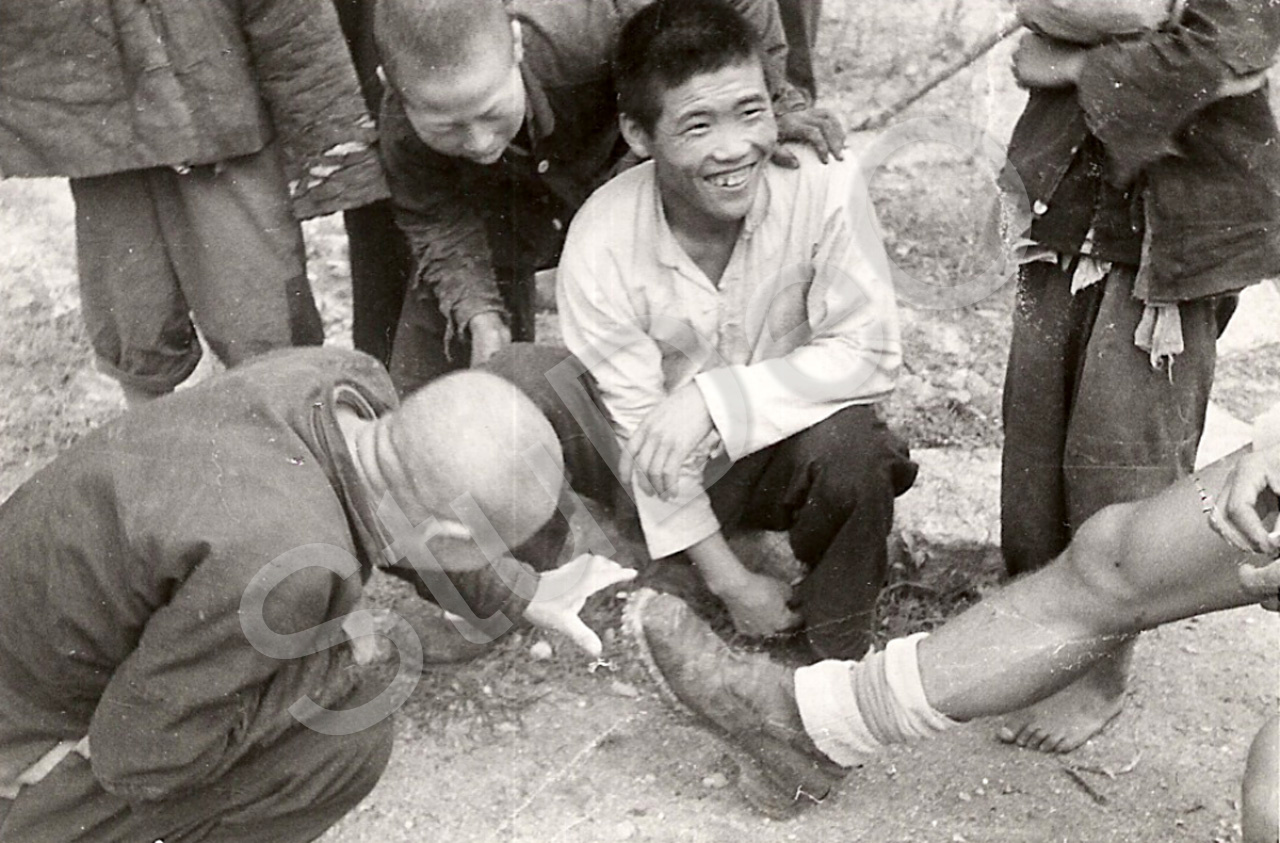 Beschreibung: Begegnung bei der Wanderung in Bergen im Grenzgebiet zur Mongolei. mit Chinesen, die die europäischen Bergsteigerstiefel von Pastor Wolfgang Müller bestaunen.