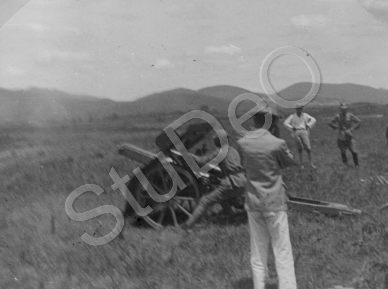 Beschreibung:  Tang Shan am 27.06.1931. Probeschießen der Bofors Geb. Kanoniere. Boforsgeschütz beim Abschießen.