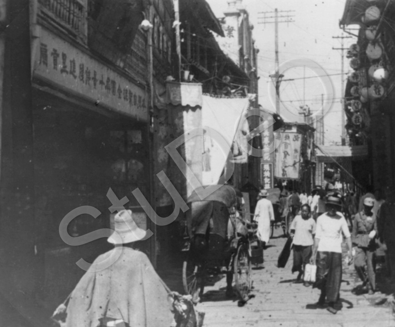 Beschreibung: Eine belebte, enge Straße in der Innenstadt Nanking.