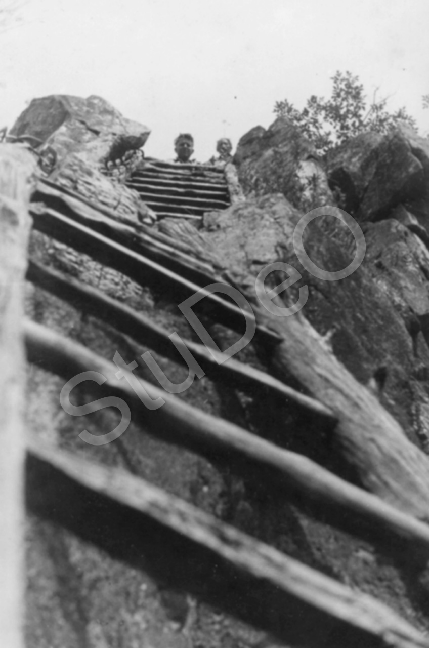 Beschreibung: Leiteraufstieg zu einem Bergtempel. Oben li. Dr. Karl Günther.