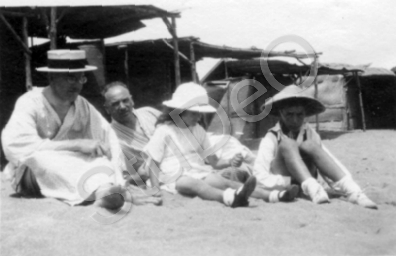 Beschreibung: Prof. med. Richard Gerngroß mit Sohn und Tochter am Strand vor Strandhütten.