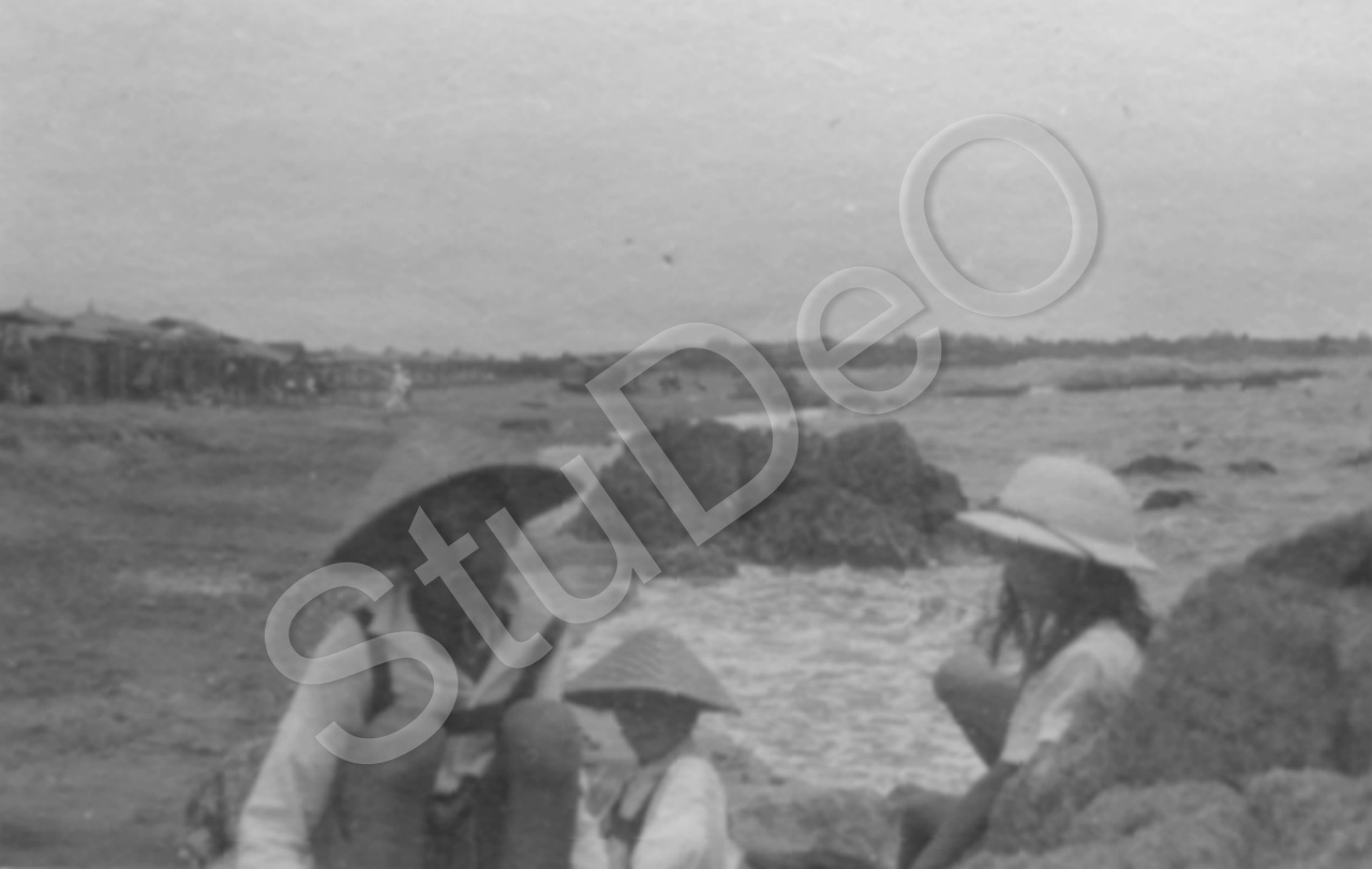 Beschreibung: Helene Gerngroß mit tochter Barbara und Sohn Paul Ruprecht am Strand auf Felsen. Im Hintergrund Meer und Strandhütten.