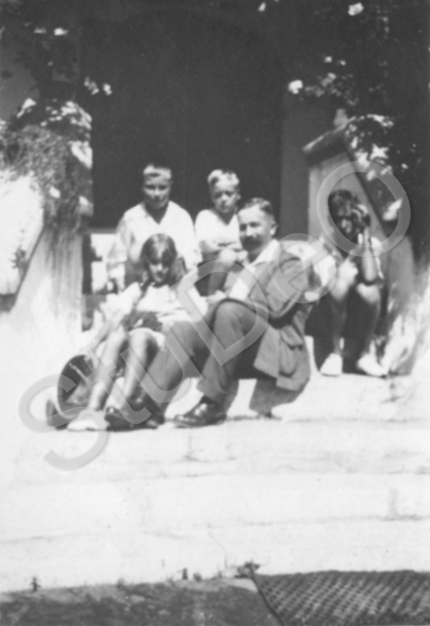 Beschreibung: Hinten vlnr. Alec Siemssen und, Paul Gerngroß. Vorne Barbara, Prof. Richard und Richard Otto Gerngroß auf einer Haustreppe sitzend.