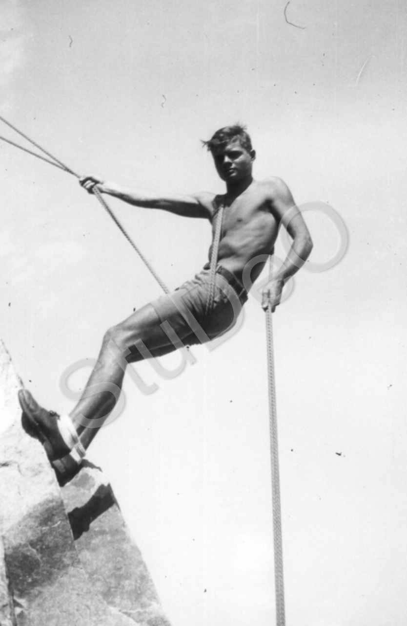 Beschreibung: „Theo Hudec beim Abseilen im Steinbruch von Peitaiho unter Anleitung von Pastor Müller“ am 24.08.1944.