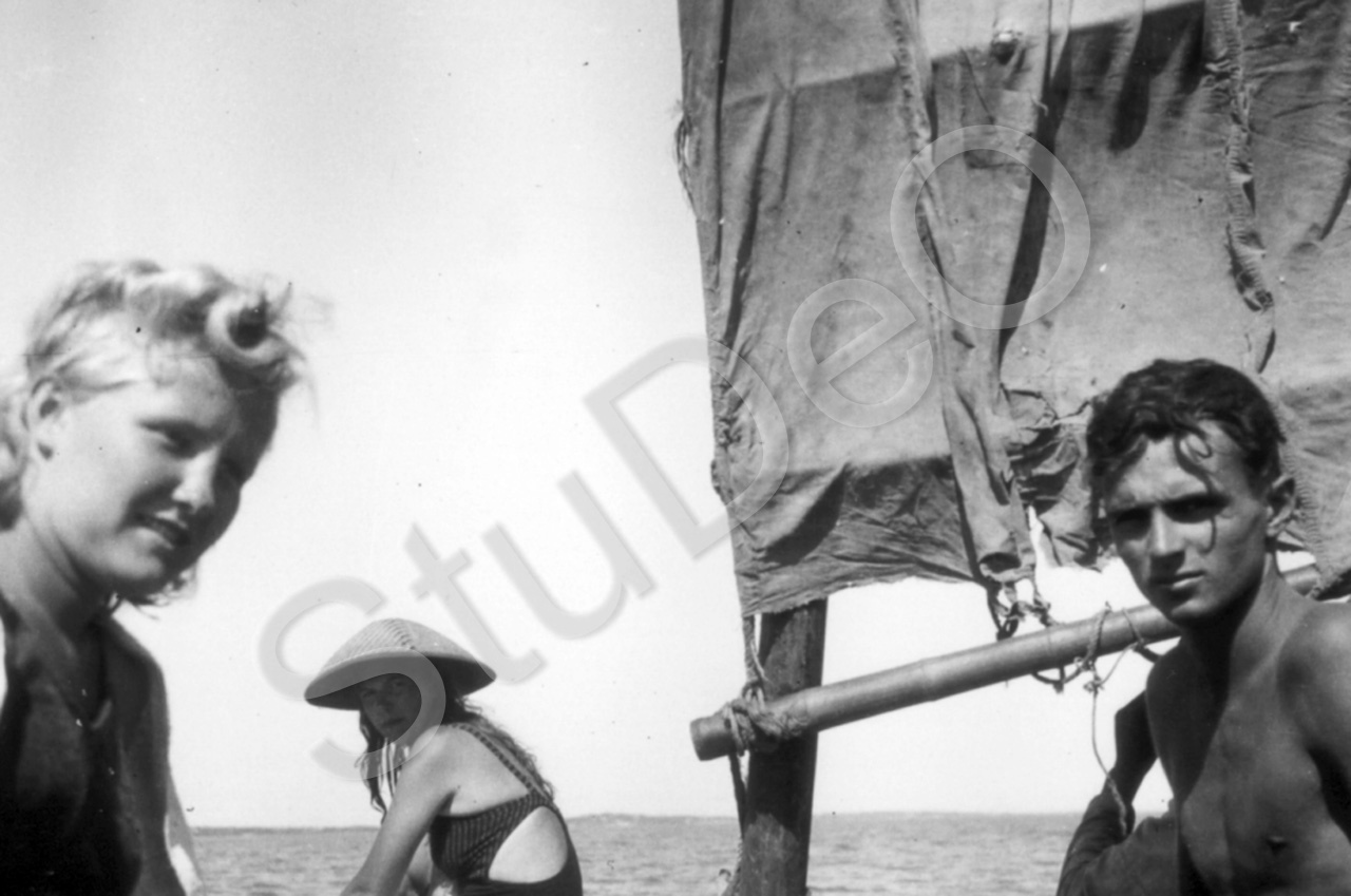Beschreibung: „Auf der Rückfahrt vom 2. Fluß“ am 22.08.1944. Li. Christel Skoff, Musche Bahlmann, Martin Hudec.