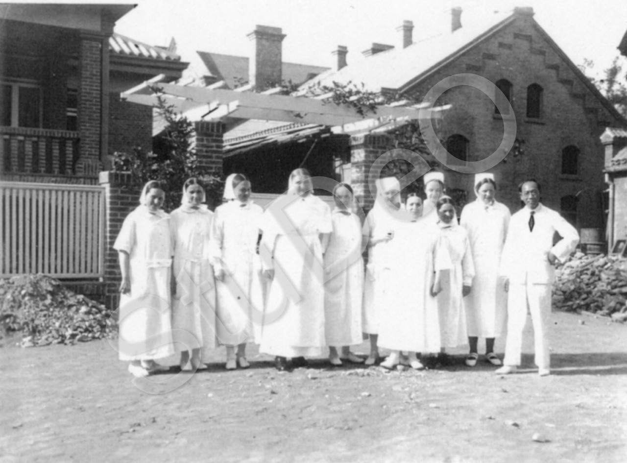 Beschreibung: Vor dem Neubau des Leichenhauses, links Isolierhaus. V.l.n.r. Schw. Christine Ottmar („Elisabeth“), Babette Kochendörfer, ?, Oberschw. Jo­hanna Bayerlein, Sophie Kögler, ?, Julie Schuler, ?,?,?, Gottlieb (ein en­ger Mitarbeiter von Sanitätsrat Edmund Dipper.
