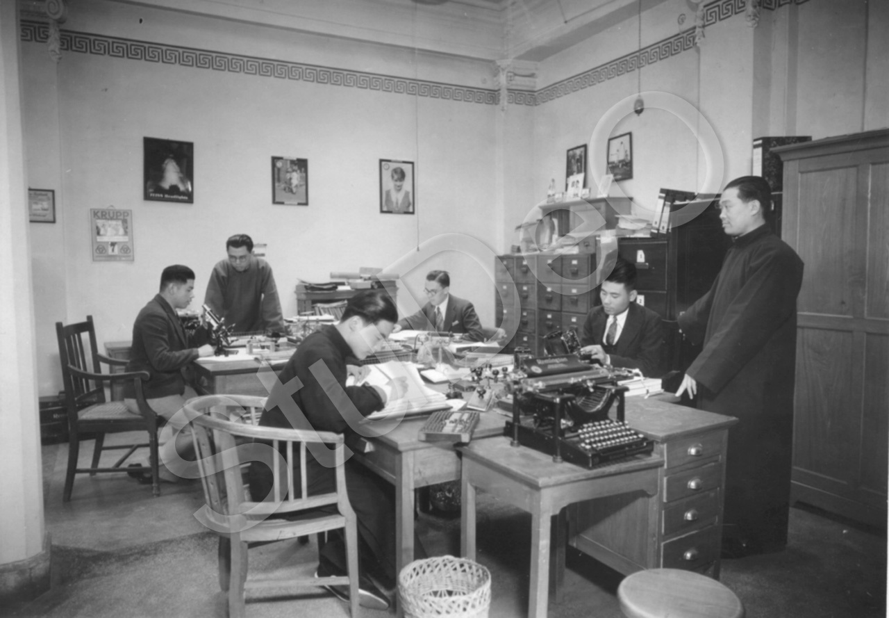 Beschreibung: Büroraum der optischen Abteilung in der Filiale von Carlowitz & Co. in der Hatamen­straße. Der Leiter Ernst Jährling mit seinen chinesischen Mitarbeitern: Liu Tao Chen, Chou Cheng Hou, Ha Cheng An, Liu Hsiang Chen und Wang Yung Cheng.
