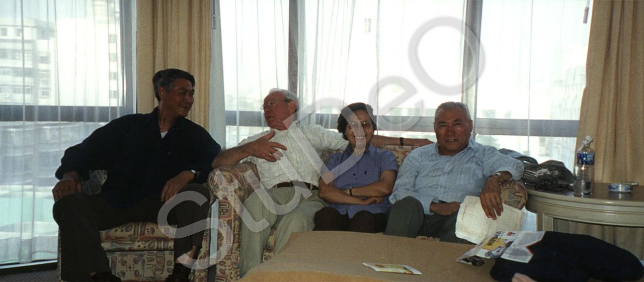 Beschreibung: Im Peace Hotel sitzen die Reisenden Familie Kupka und der Besuch Familie Jura. V.l.n.r. Ehemann von Wang Yun Jue, Max Kupka, Wang Yung Jue und Jura Feng. Jura und Max waren Schulkammeraden an der Dt. Schule Peking in den 20iger Jahren.