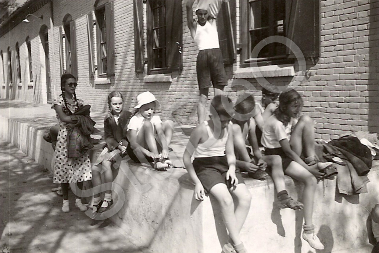 Beschreibung: Schüler auf Sockel vor Schulbaracke. v. li. Anneli Wilm ?, Irina Rebrin ?, weitere unbekannt, darunter Flutkinder aus Tientsin?.