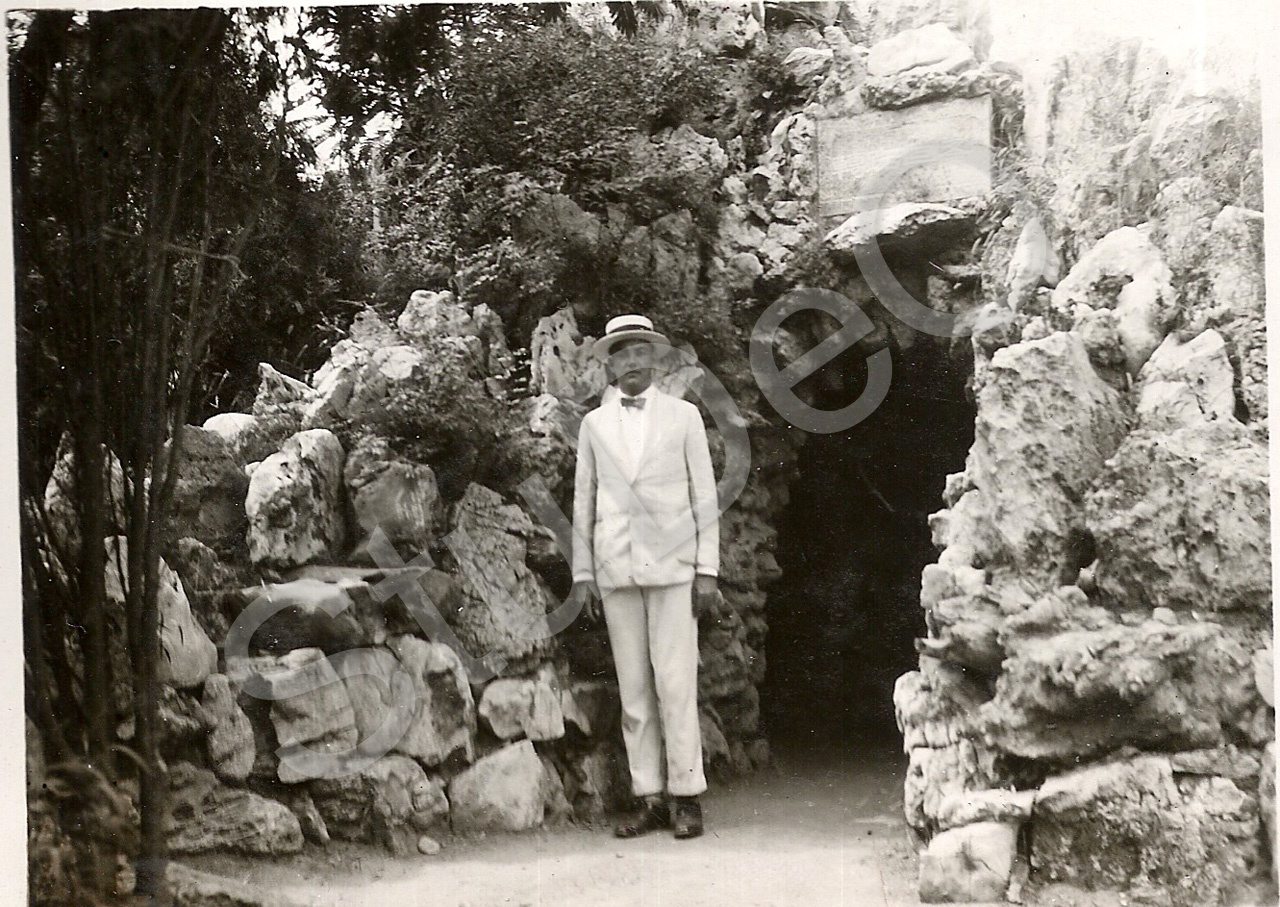 Beschreibung: Robert Puck steht vor einer Steinhöhle in Tsinanfu.