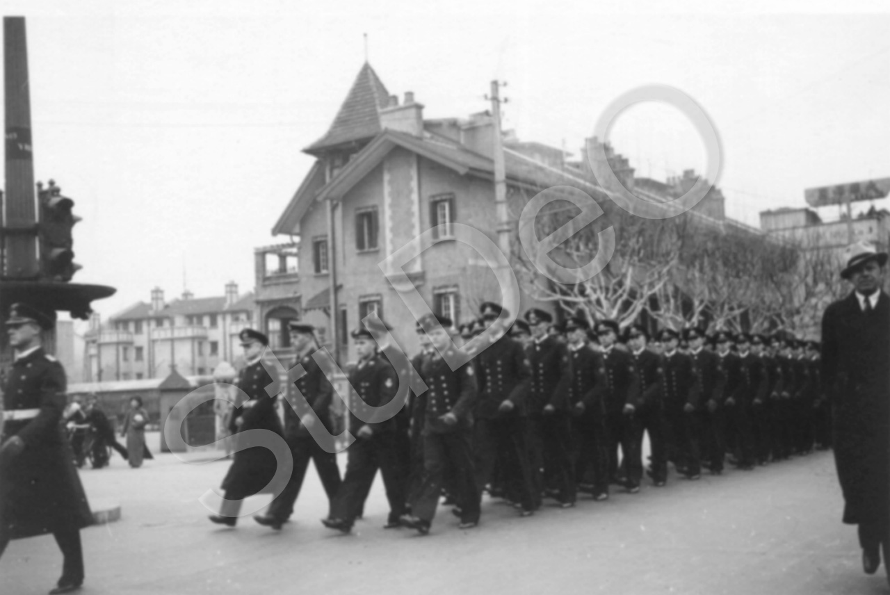 Beschreibung: Vermutlich: Soldaten der „Emden“ marschieren durch Shanghais Straßen.