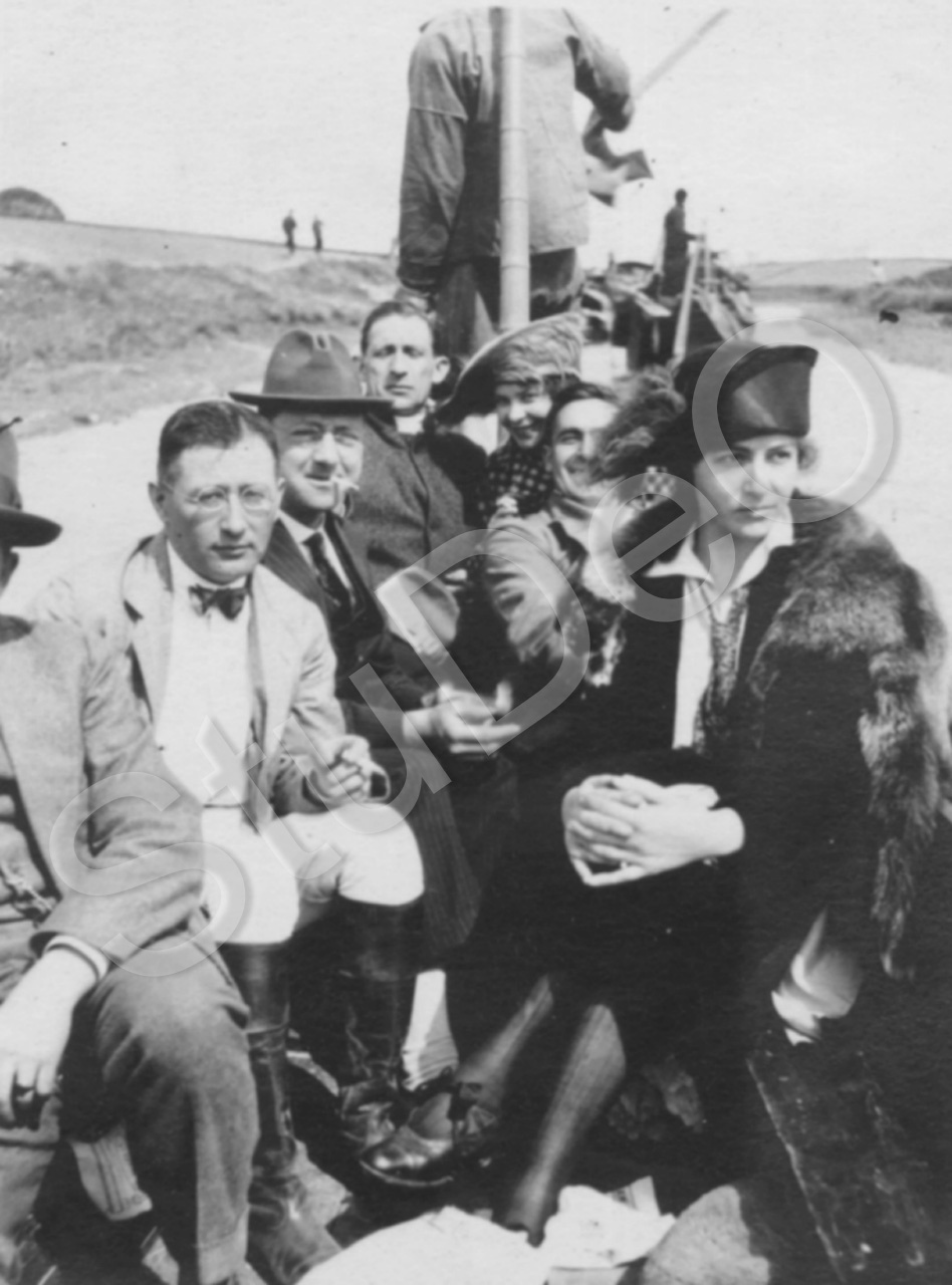 Beschreibung: Mitglieder des Deutschen Reitvereins auf einem Boot vorne l. mit Reit­­stiefel: Wilhelm Severitt, rechts: Otto Hauer. Ehepaar Boren und Matthes.