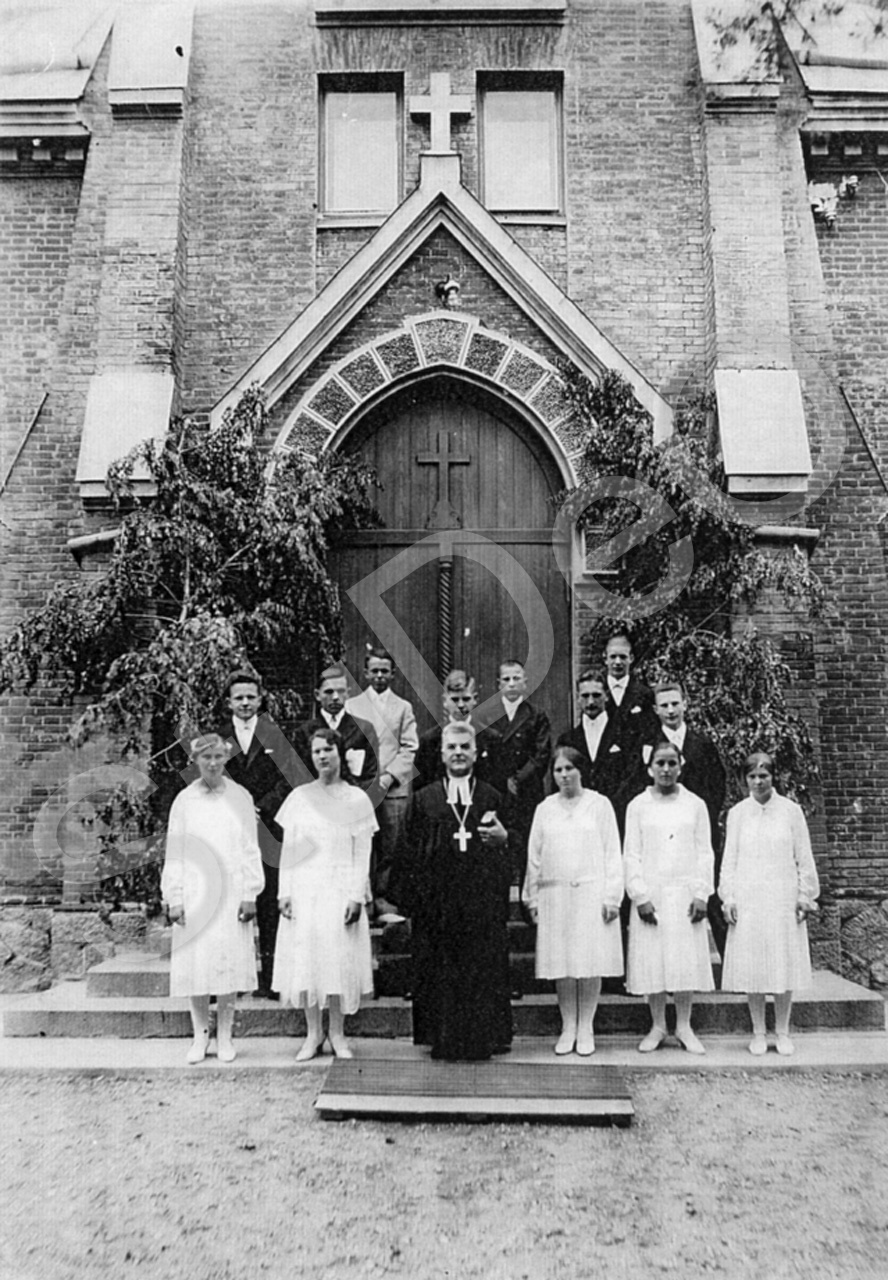 Beschreibung: Pastor mit seinen Konfirmanden vor der deutschen ev. Kirche Harbin. Unter den Jungendlichen vermutlich aus den Familien Würfel und Felsing. Zu der Zeit gab es 2 Pfarrer. Pfarrer Charles W. Kastler?, der 1937 Harbin verlies.