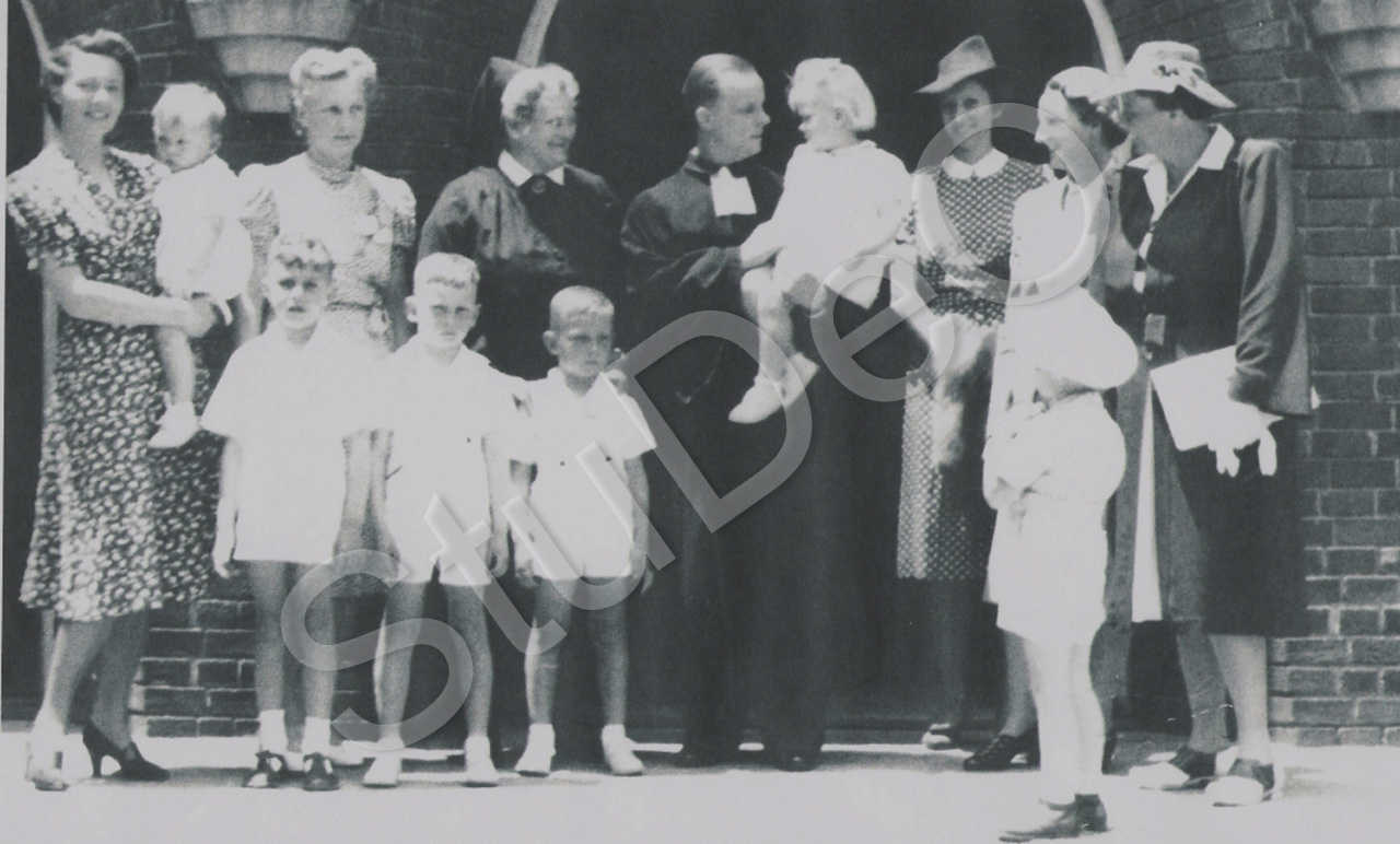 Beschreibung: Taufgesellschaft vor der Deutschen Kirche Schanghai. Täufling: Hedi Drebing, anwesend: Ellen Hoffmann, Ilse Drebing, Schwester Alwine Ham­macher, Pastor Fritz Maass, Hedi Drebing, Elli Leutsch, Grete Siem­ssen, Hede Cortum, Jürgen Hoffmann, Peter Drebing, Klaus Drebing.