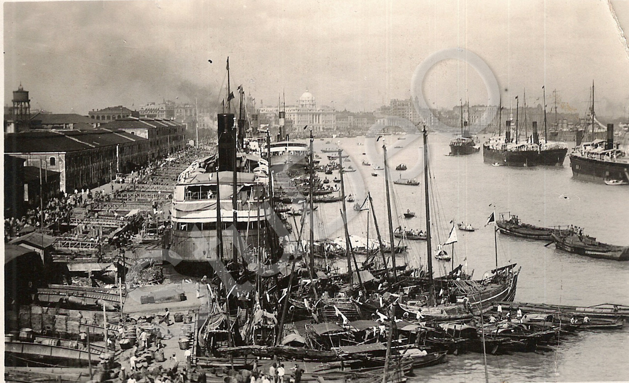 Beschreibung: „Hafenbild Shanghai. Die Kais setzen sich beiderseits längs der Ufer kilometerweit fort“.
