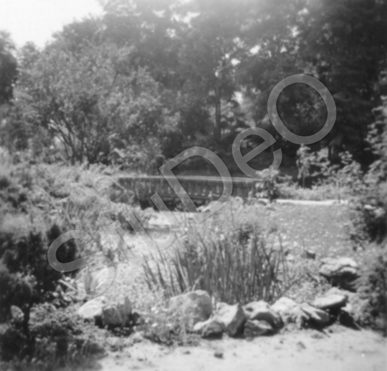 Beschreibung: Annelene Günther zu dem Bild „Teil des Gartens. Teich Brücke u. hinten ‚Wald’, links hinter der Brücke ein Aprikosenbaum“.