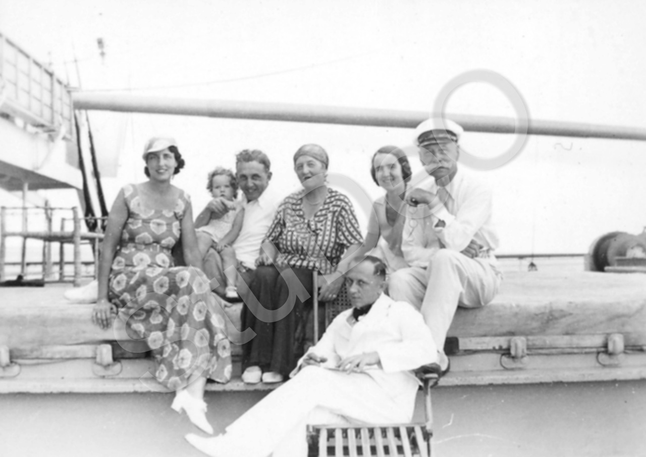 Beschreibung: An Deck der „Saarland“ (Schwesterschiff der Sauerland), Richtung Deut­sch­land. v.li. Miss Abraham, Herr Gregor mit Ingrid Halle, Frau Grundt, Frau Halle, Hermann Huwer. Sitzend: ?.