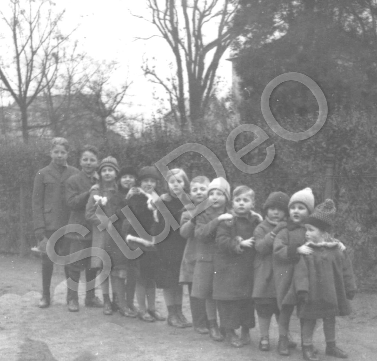 Beschreibung: „12 Enkel von Großeltern Balser, v.li.n.re. Karl August, Helmut, Märta, Else, Lotte, Irmgard, Christian, Reinhart, Johannes, Traudel, Gerti und Agnes ».