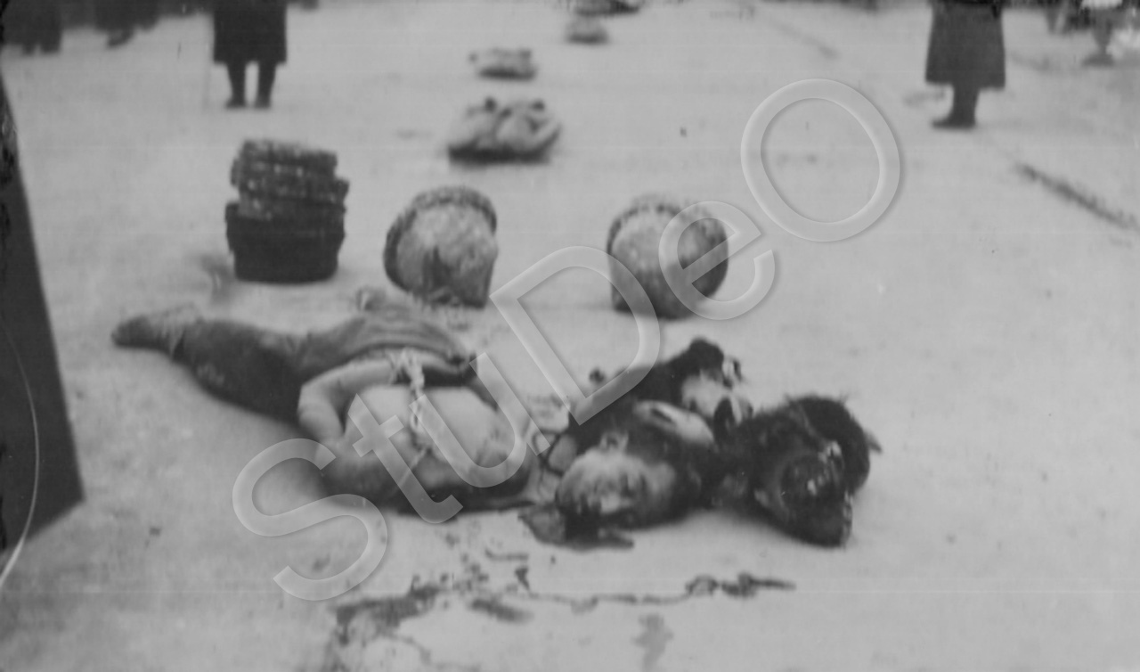 Beschreibung: Enthaupteter Plünderer liegt auf der Straße.