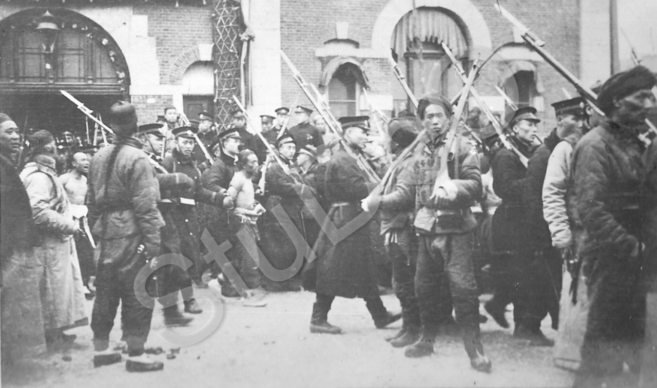 Beschreibung: Plünderer werden vom Gefängnis zum Enthauptungsplatz gebracht.