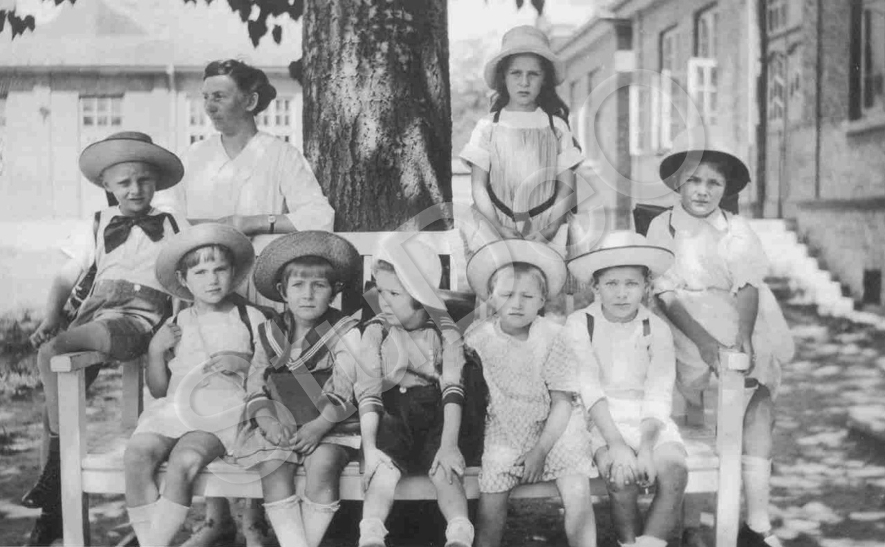 Beschreibung: Frieda Jensen (li.) unter der Pappel im Schulhof mit der Einschulklasse. Re. vom Baum Ada Bielefeld, v.l.n.r. Uwe Jensen, Tatjana Pitrowitsch, Ingeborg Lüders, Elsbeth Kirn, Hildegard Granz, Georg Hildebrandt, Gerda Lüders.