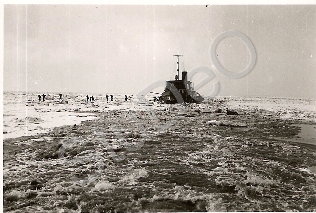 Beschreibung: 1936 große Kälte friert den Hai Ho ein. Der Eisbrecher „Christine Möller“ bei der Arbeit.