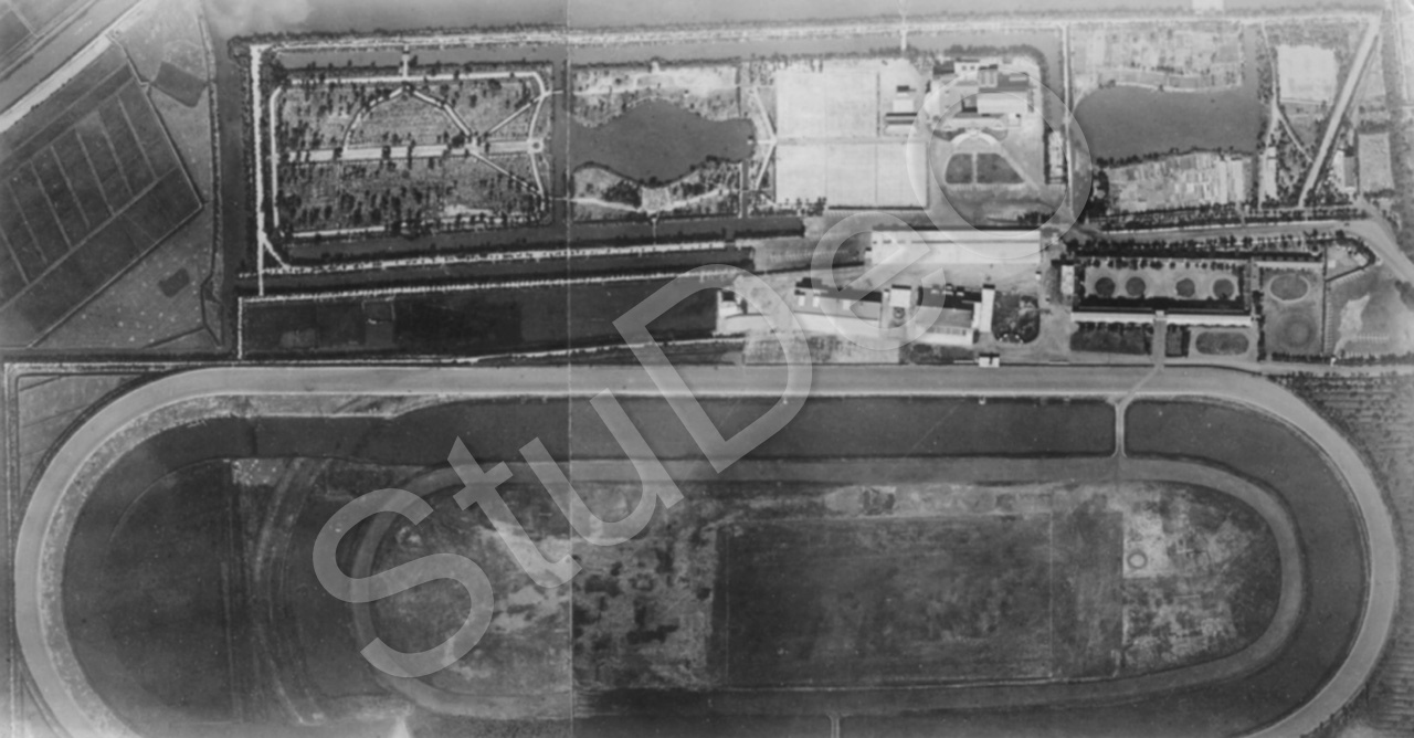 Beschreibung: Aufnahme von der Rennbahn und den Gebäuden des Race Course im Süd-Westen von Tientsin.
