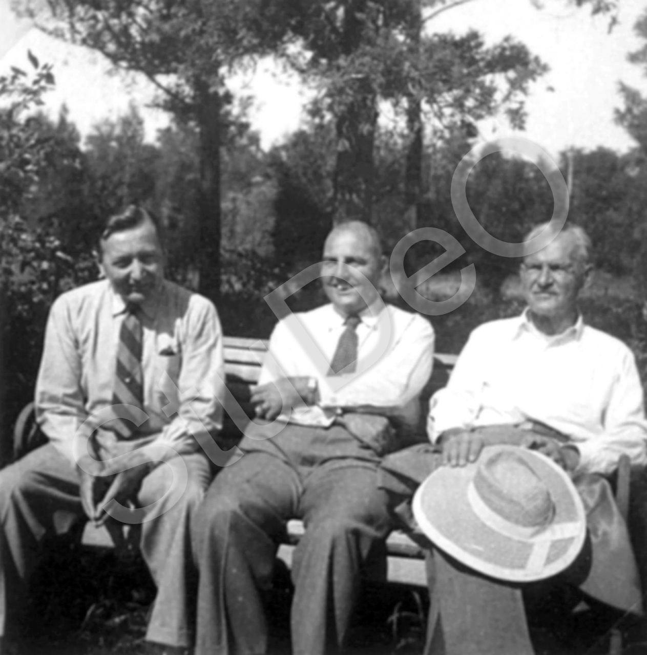 Beschreibung: Hans Steeneck, Rolf Blume und Johannes Peter Wormsbecher auf einer Bank im Grünen, in Tientsin?