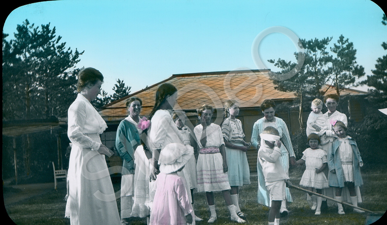 Beschreibung: Geburtstagsfeier, beim Topfschlagen im Garten. Erna Lenz mit Eva. Koops (verh. Coermann) an der Hand,  beim Schlagen, Hans Lenz auf dem Arm seiner Ama.