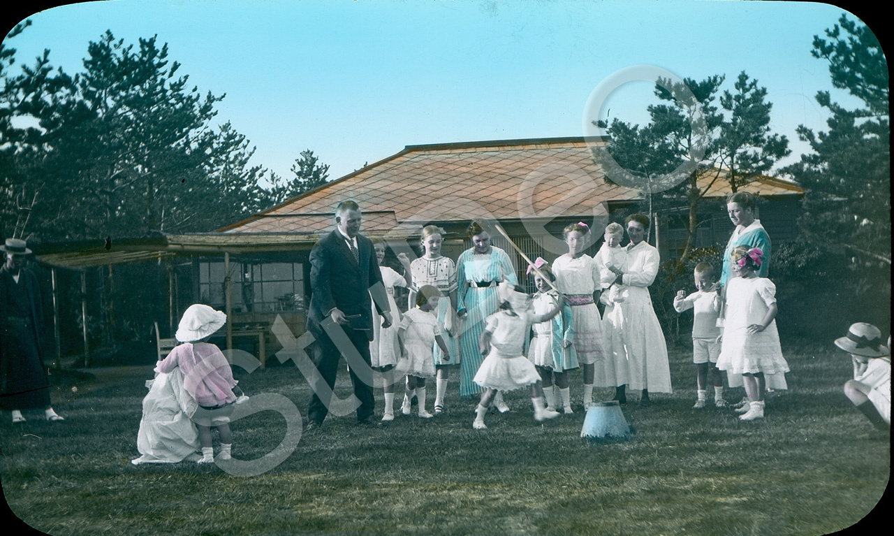 Beschreibung: Geburtstagsfeier, beim Topfschlagen im Garten. Erich Lenz, re. von ihm Eva. Koops (verh. Coermann), Rose Lenz beim Schlagen, Hans Lenz auf dem Arm seiner Kinderfrau. Erna Lenz im gestreiften Kleid.
