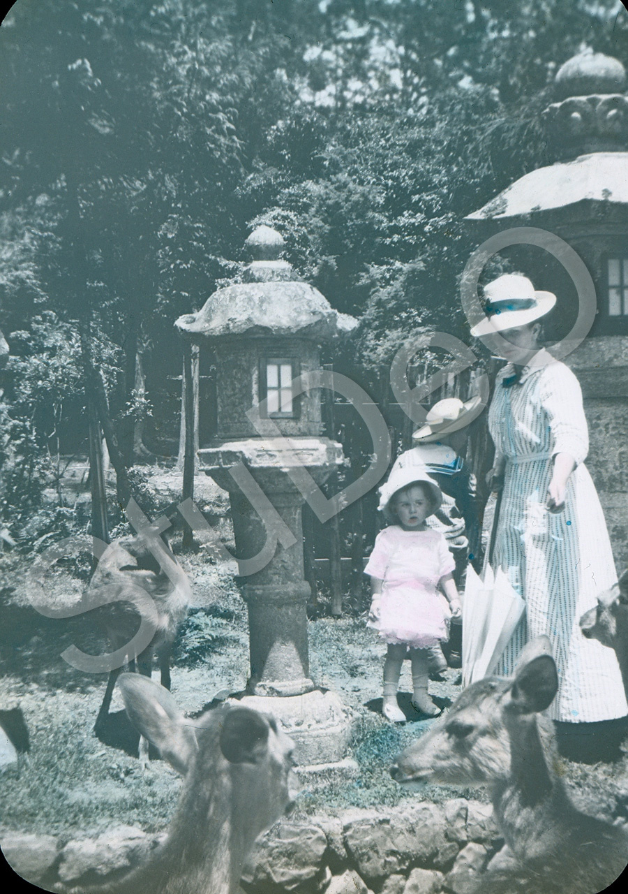 Beschreibung: Erna Lenz mit Kindern Günther und Rose in Nara bei den Axeshirschen.