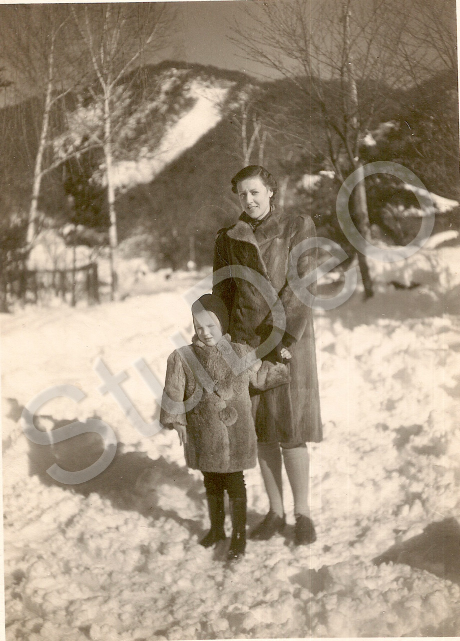 Beschreibung: Erika Denklau mit Tochter Dagmar im Schnee in Funatsu.