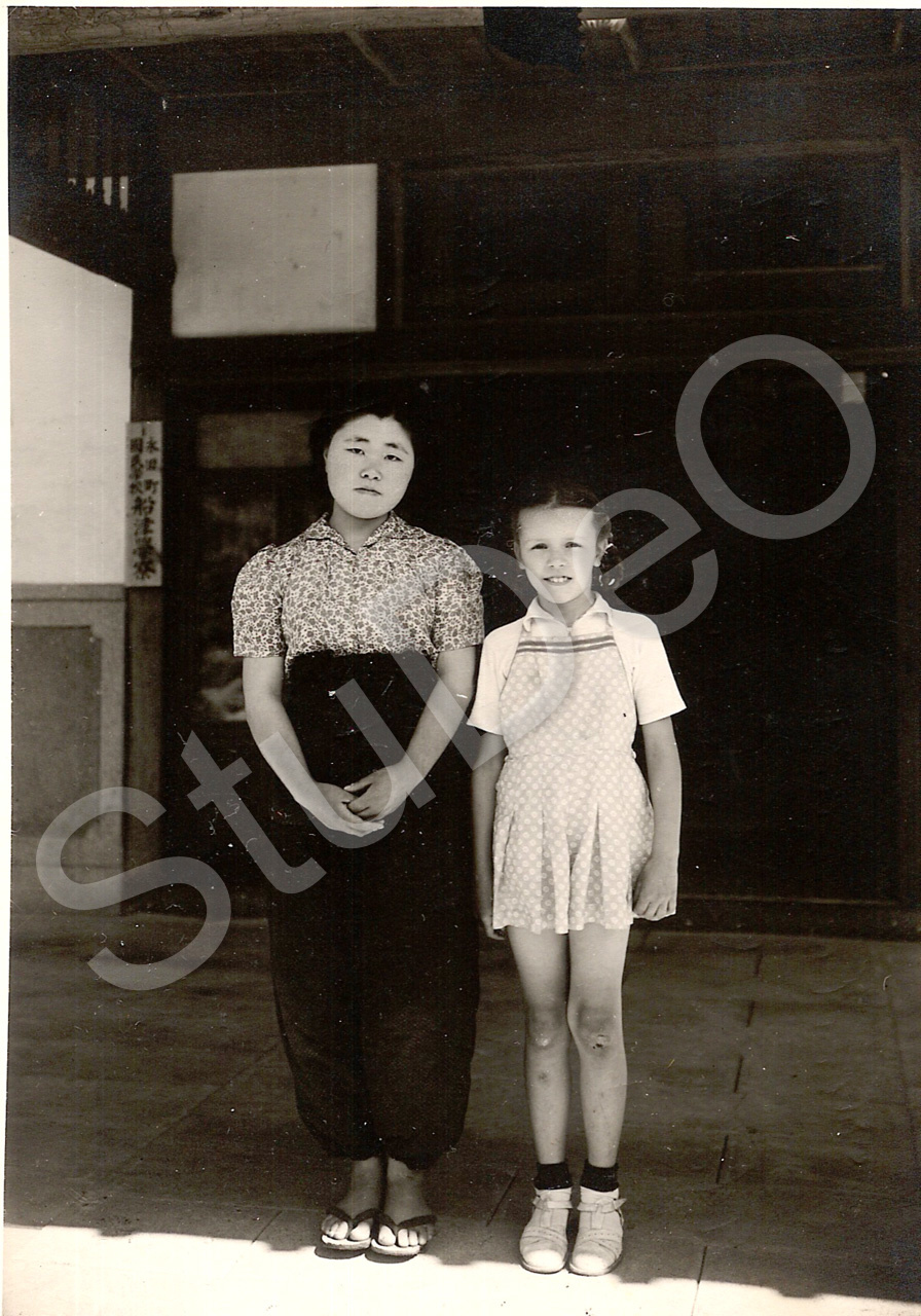 Beschreibung: Evelyn Köhler mit ihrer Amah vor dem Eingang des Funatsu-Hotels.