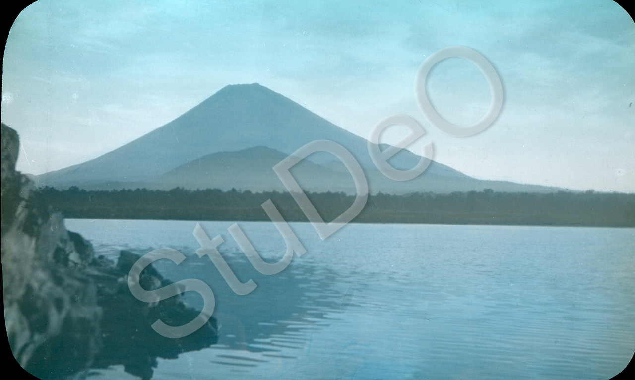 Beschreibung: Fluß um den Fuji. Der Fluß wurde durch Ausbruch des Vulkans stellen­weise unter Bildung von 5 Seen verschüt­tet.