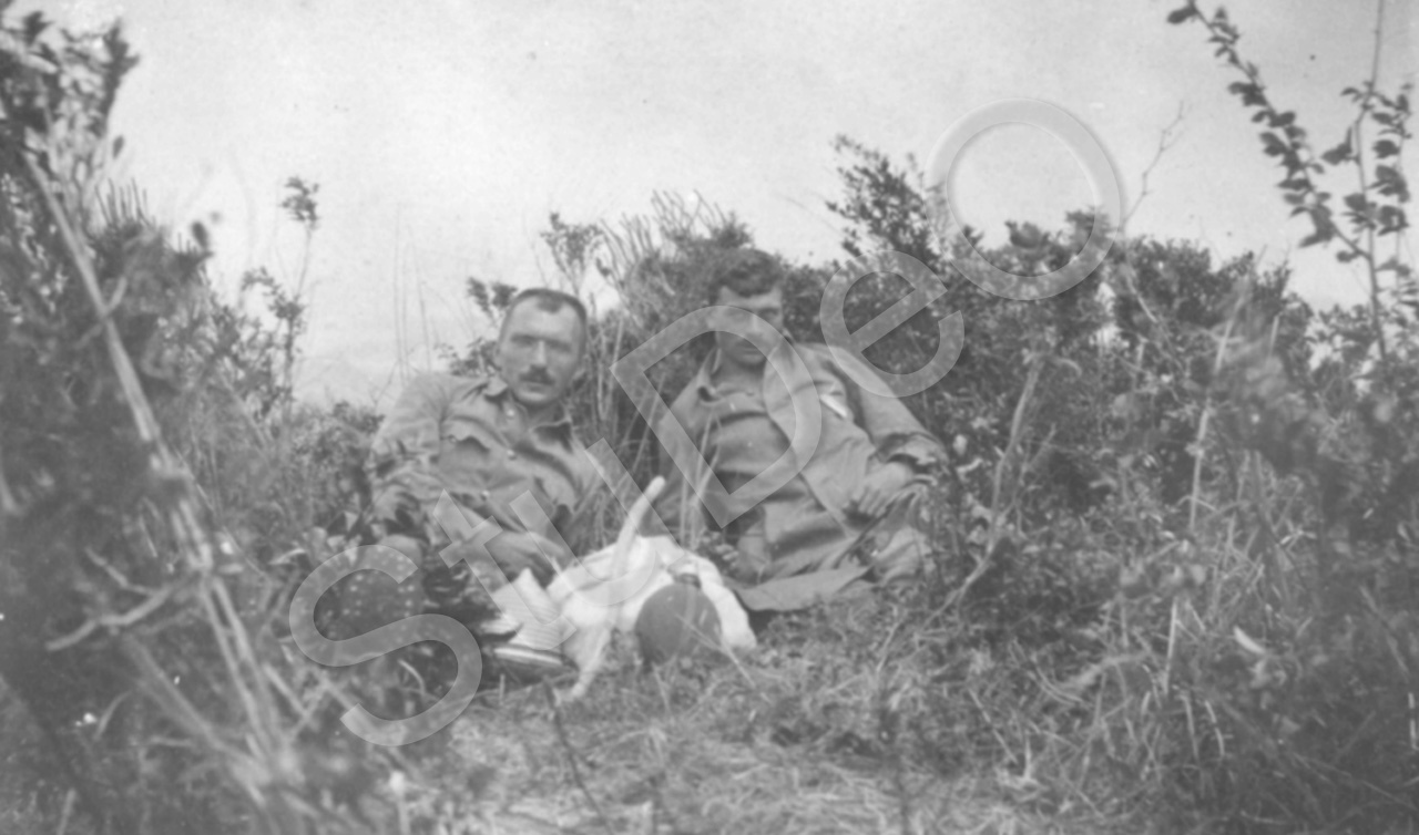 Beschreibung: Wilhelm Meller und von Gimborn auf dem Kahlen Berge in der Maruto Enge bei einer Wanderung ohne Bewachung vom Kriegs­gefange­nen­lager Bando.