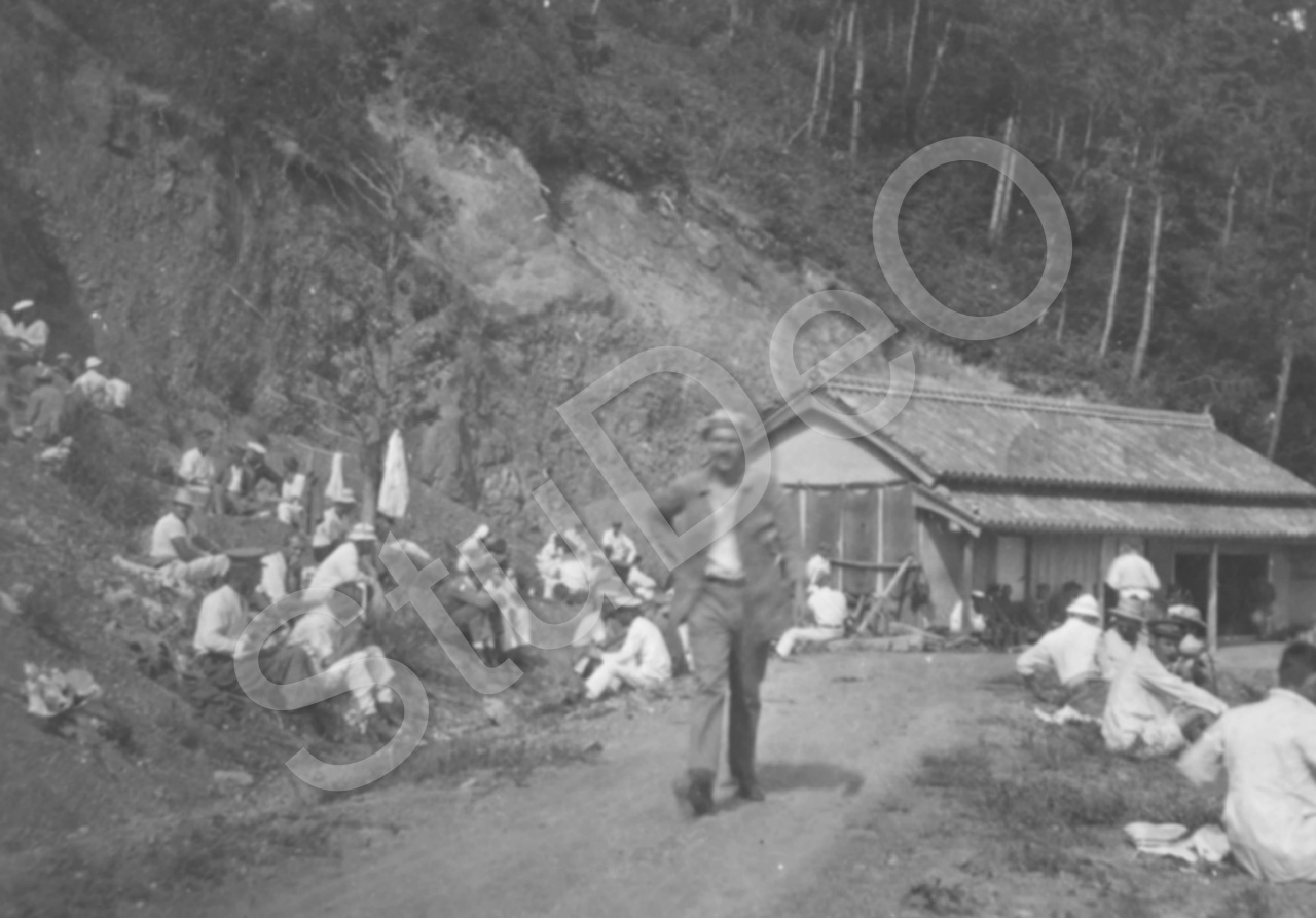 Beschreibung: Dt. Gefangenen vom Kriegs­gefange­nen­lager Bando machen einen Ausflug im Osakaberg. Rast am Berghang.