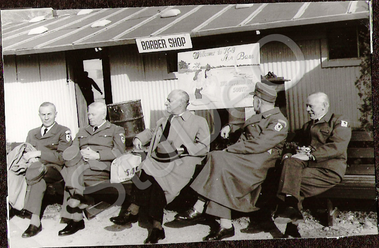 Beschreibung: Auf dem "K-9 Air Base“ des US-Army Camps. Prof. Günther Huwer (ganz li.) und andere Mitglieder des Rote Kreuz Hospitals warten vermutlich auf die „Medal of fredom“-Verleihung. Ein Schild zeigt: „Welcome to K-9 Air Base. The Riviera of Southern Korea“.