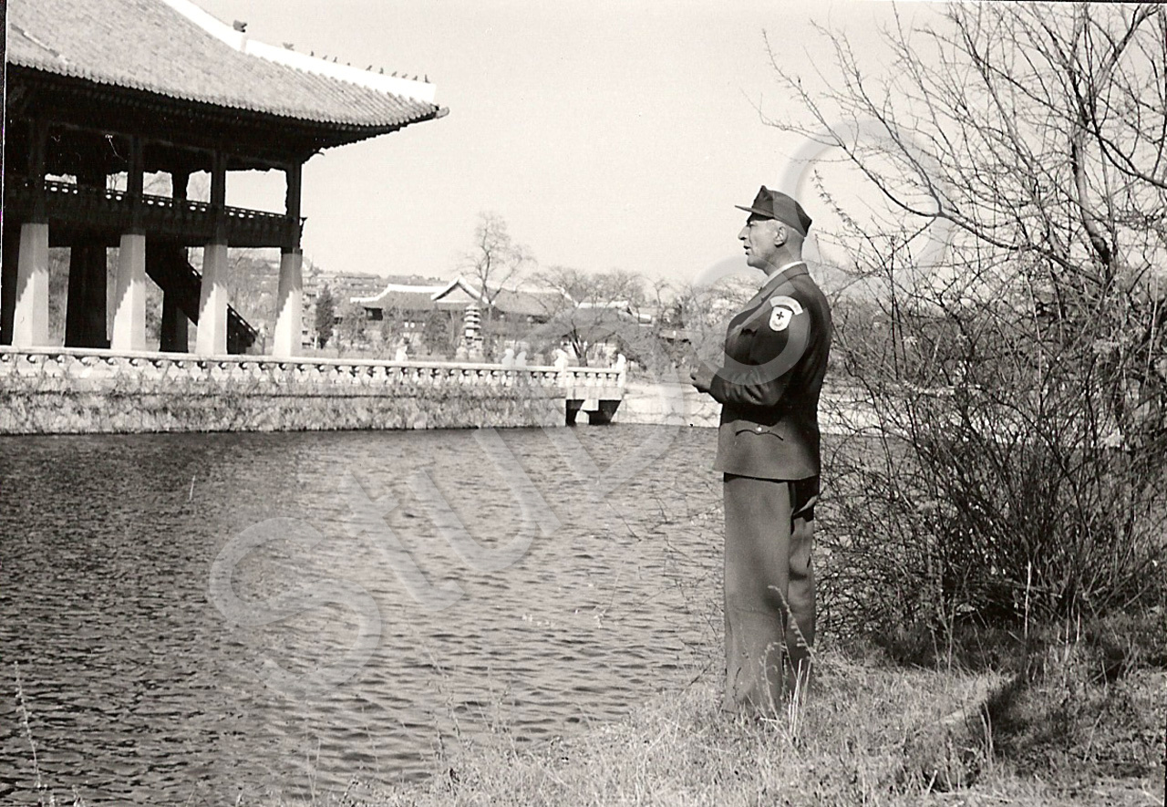 Beschreibung: Dr. Günther Huwer in Rote Kreuz-Uniform vor einer Pagode von Wasser umgeben. Vermutlich in Seoul.