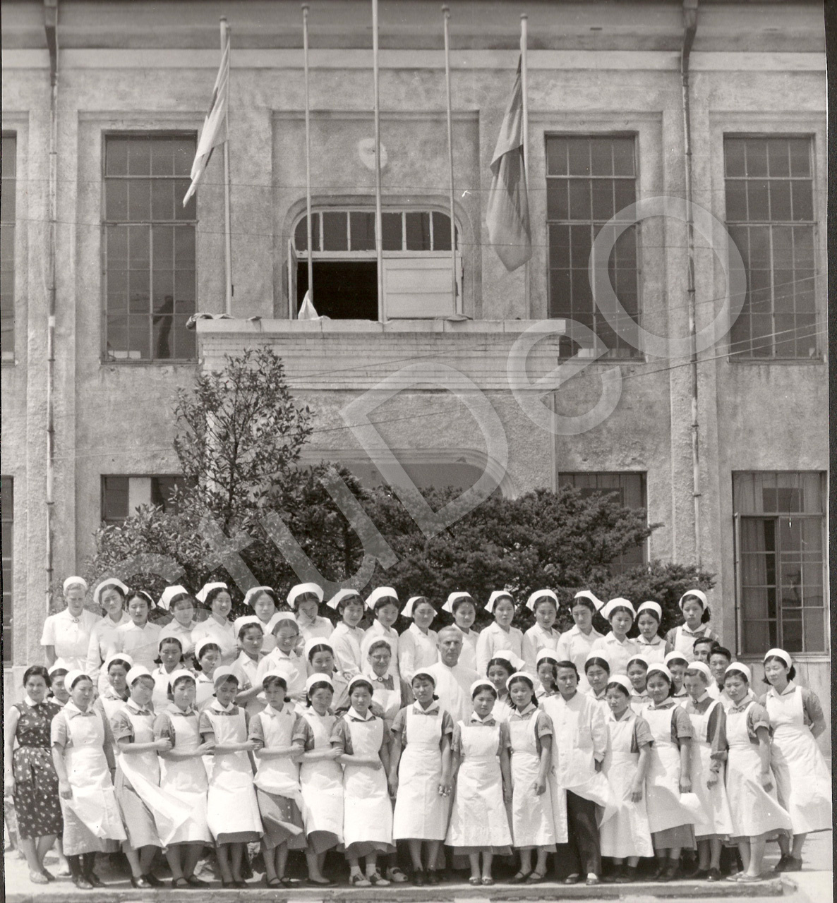 Beschreibung: Dt. Rote Kreuz Hospitals Pusan. Schülerinnen (Anfänger) der „Schwes­tern­schule“. Die Hauben sind weiß, ohne Linien.