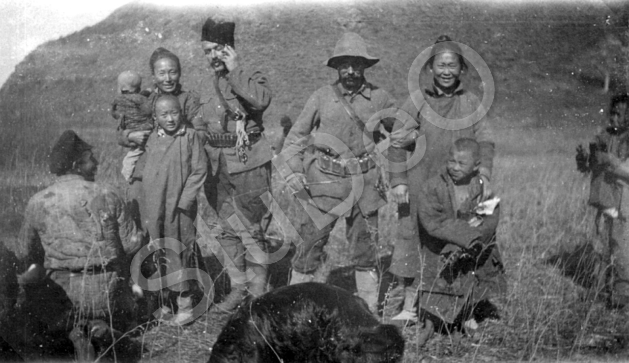 Beschreibung: Johannes Peter Wormsbecher beim Jagen in der Mandschurei, mit einheimischen Frauen und Kindern