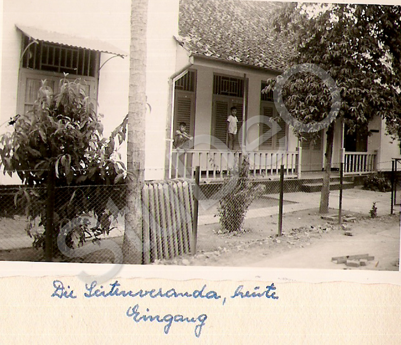 Beschreibung: Die Seitenveranda des ehemaligen Wohnhauses der Familie Kranz in Djakarta am 17.05.1954. „Heute ist es der Eingang. Hoch­zeits­reise A. und F. Mittag.
