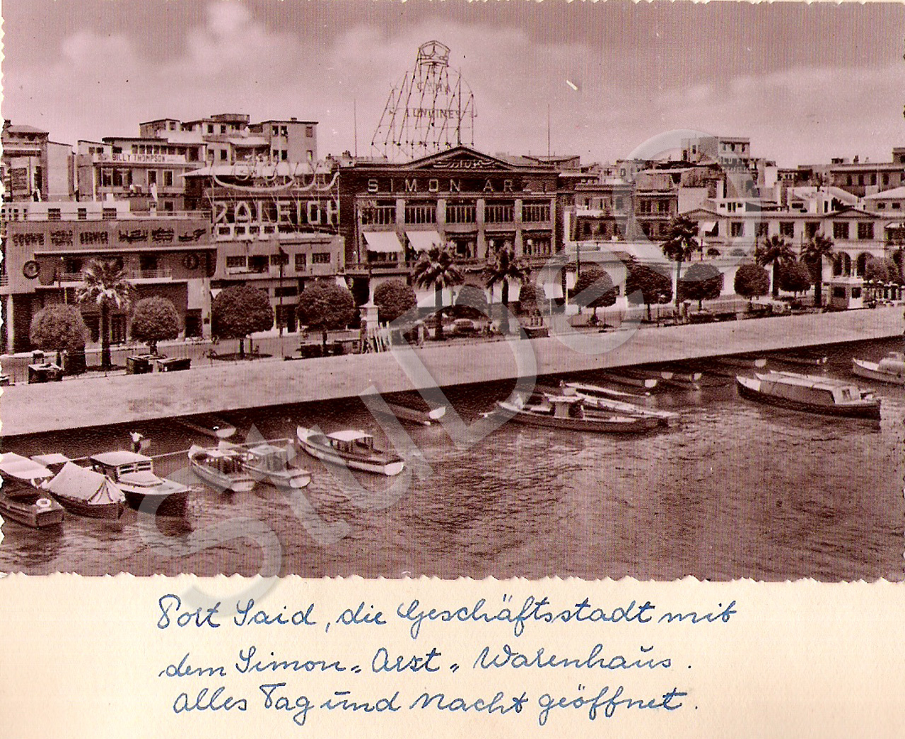 Beschreibung: Die Geschäftsstadt Ports Said mit dem Warenhaus Simon Arzt. Alles ist rund um die Uhr geöffnet. Hochzeitsreise A. und F. Mittag.