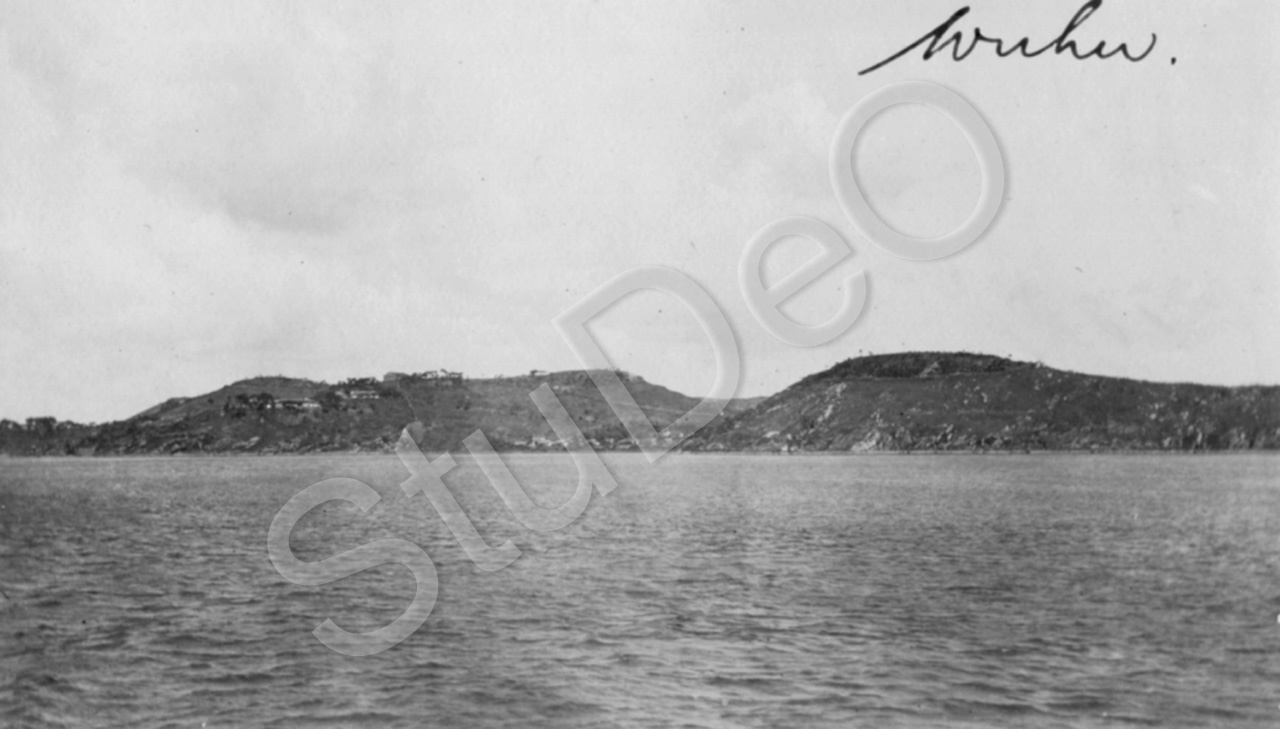 Beschreibung: Hügeliges Ufer mit dem Ort Wuhu. Stromaufwärts von Nanking.
