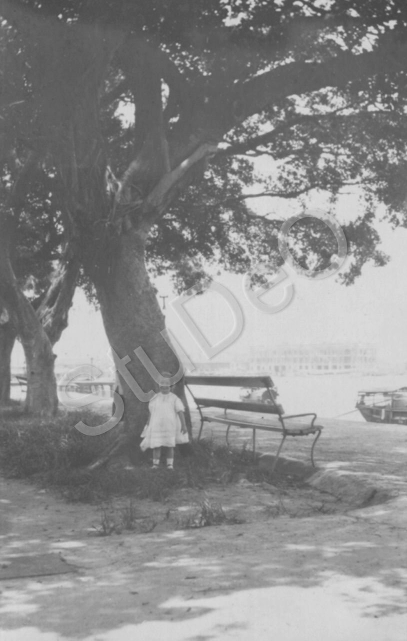 Beschreibung: An der südöstlichen Uferpromenade „The Bund“ der Insel Shameen mit Blick über den Perlfluß am 27.08.1913. An der Stelle entstand 2000 das „White Swan Hotel“. 2 ½ Jahre altes Mädchen.