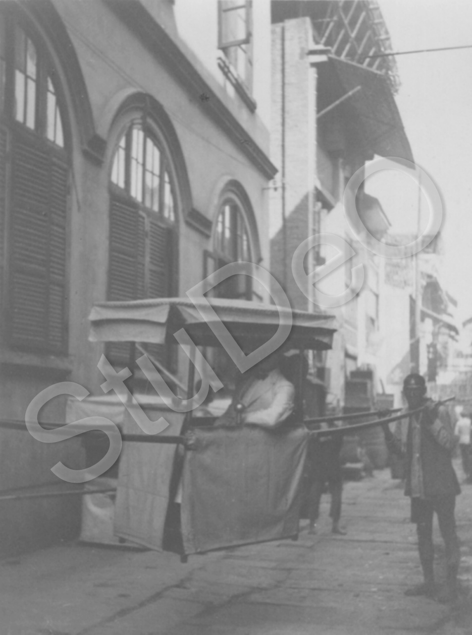 Beschreibung: Hermann Körner in der Sänfte. „Diese Sänfte benutzt man, um sich durch die engen Straßen durchtragen zu lassen, wo keine Riksha fahren lann.