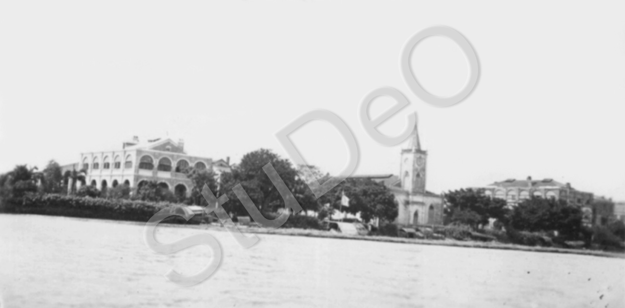 Beschreibung: Blick auf Stadtteil Hafongtsuen am Südufer des Perlflußes vom Fluß aus gesehen. Kirche und Gebäude der Berliner Mission sind sichtbar. Hinter dem Baum in der Mitte wohnte Hermann Körner.